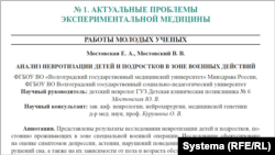 В распоряжении "Системы" оказался сборник научных работ молодых исследователей из Волгоградского медицинского университета. Год назад молодые ученые Мостовская Е.А. и Мостовский В.В. под руководством детского невролога Мостовской Ю.В. проводили анкетирование детей в Станице Луганская, которая расположена на востоке Луганской области Украины и вот уже более десяти лет находится в зоне непосредственных боевых действий.