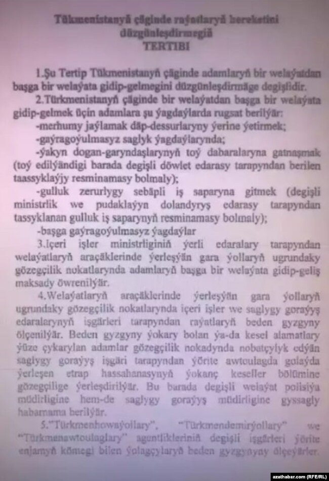 Власти также запретили передвижение граждан между регионами Туркменистана. Радио Свобода получило копию документа, который сообщает, что гражданам запрещено покидать пределы велаятов (районов) своего проживания. Выезжать можно лишь в исключительных случаях, а перед этим необходимо получить специальное разрешение от местных администраций.
